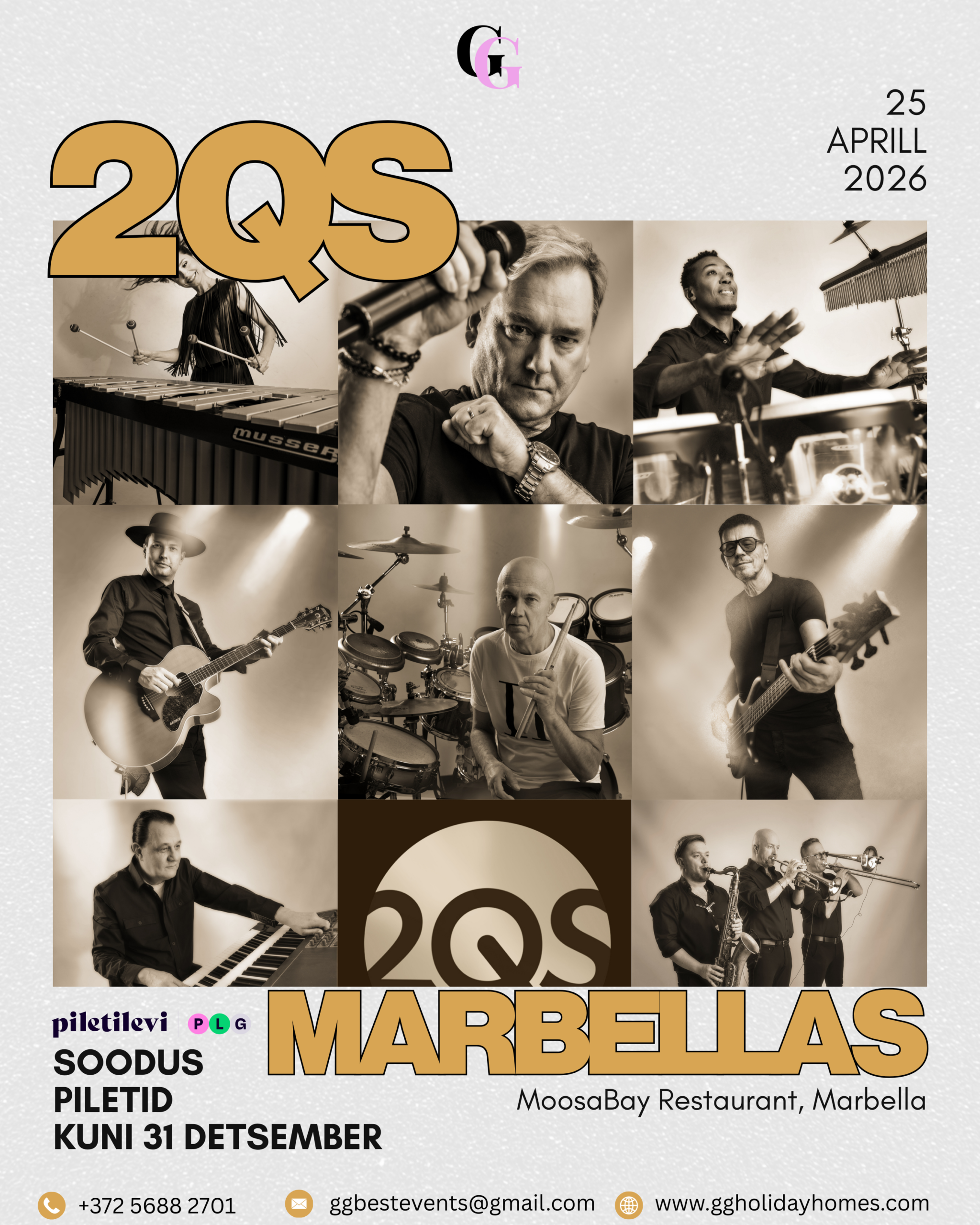MoosaBay Restaurant Av. Aragon 453, Marbella, Spain, Marbella,Malaga, Andalucia, Spain🎶 2QS – LEGEND TÄISKOOSSEISUS MARBELLAS 🎶🔥 Eesti muusika legendid Costa del Solis 🔥 Üks õhtu. Täismaja. Ajatu muusika.GG Events toob 2QS täiskoosseisus Marbellasse – õhtule, kus kohtuvad head lood, Vahemere õhkkond ja eestlaste kogukond. 📅 25. aprill 2026📍 MoosaBay, Marbella🕓 Uksed: 16:00🍽 Õhtusöök: 18:00🎤 Live set I: 20:00🎤 Live set II: 22:00🎧 Õhtu lõpetab ...