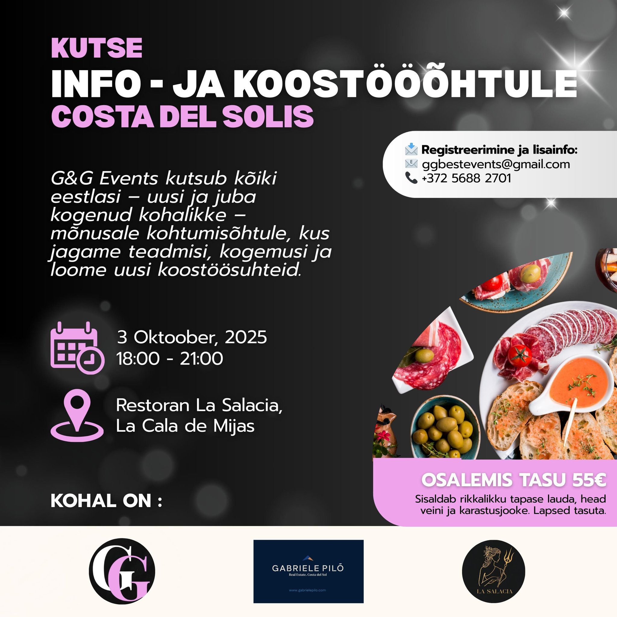 KUTSE INFO- JA KOOSTÖÖÕHTULE COSTA DEL SOLIS! 03.10.2025 18:00–21:00 Restoran La Salacia, La Cala de Mijas G&G Events kutsub kõiki eestlasi – uusi ja juba kogenud kohalikke – mõnusale kohtumisõhtule, kus jagame teadmisi, kogemusi ja loome uusi koostöösuhteid. Õhtu on vabas vormis, kus kõik küsimused Hispaania elu-olu kohta on oodatud. Vestleme: Kinnisvara ostust-müügist ja üürivõimalustest ...