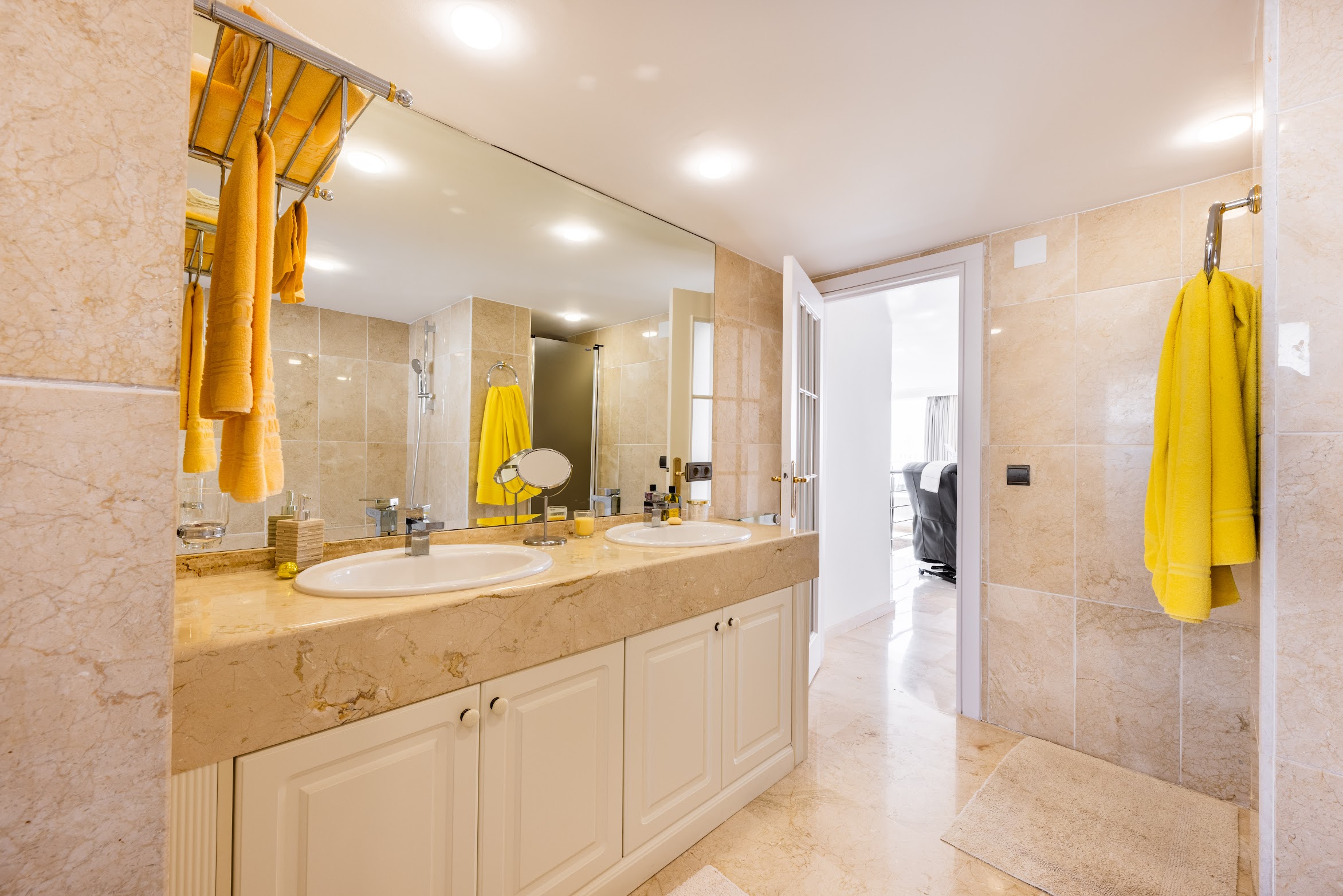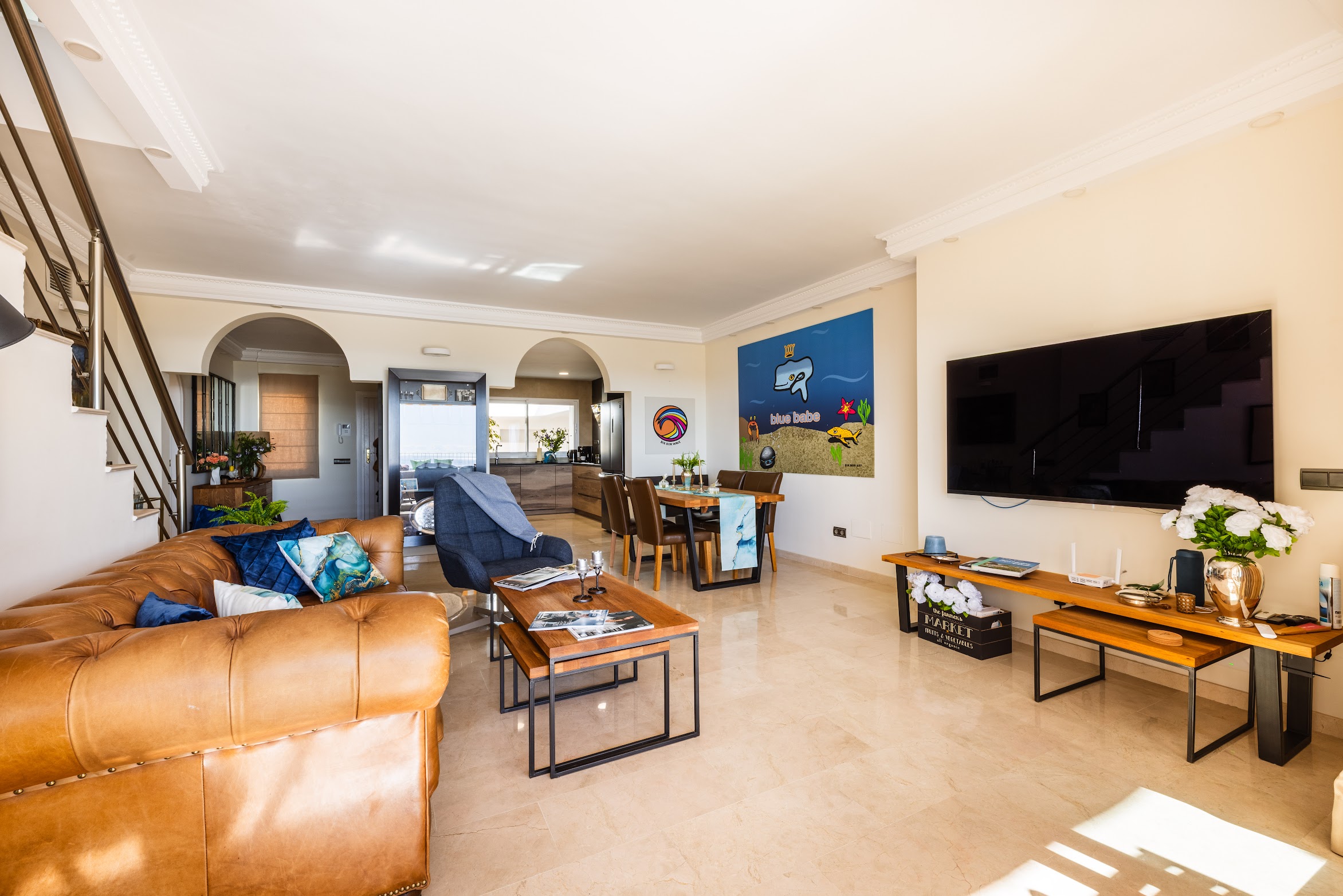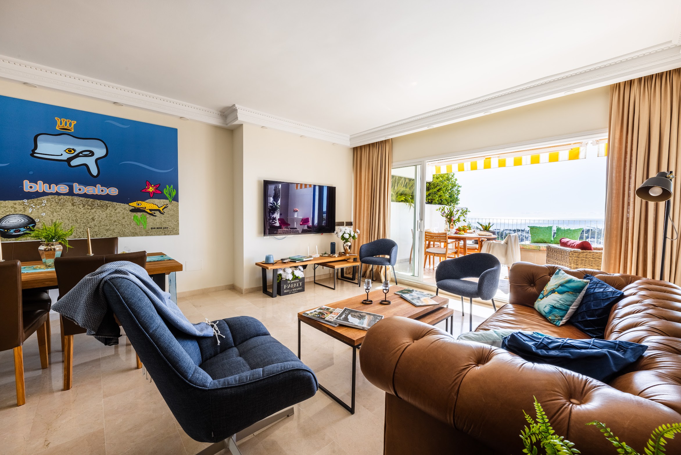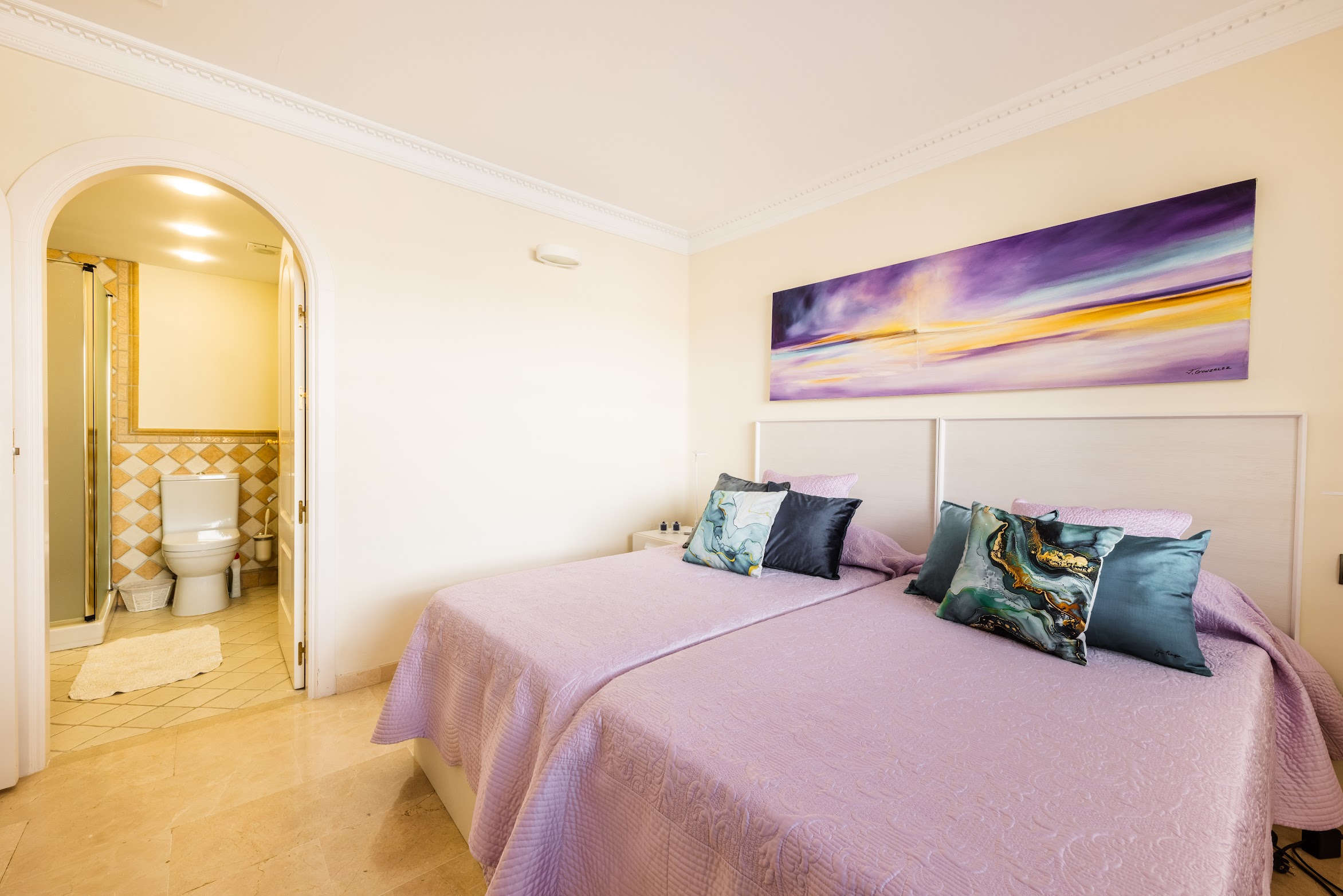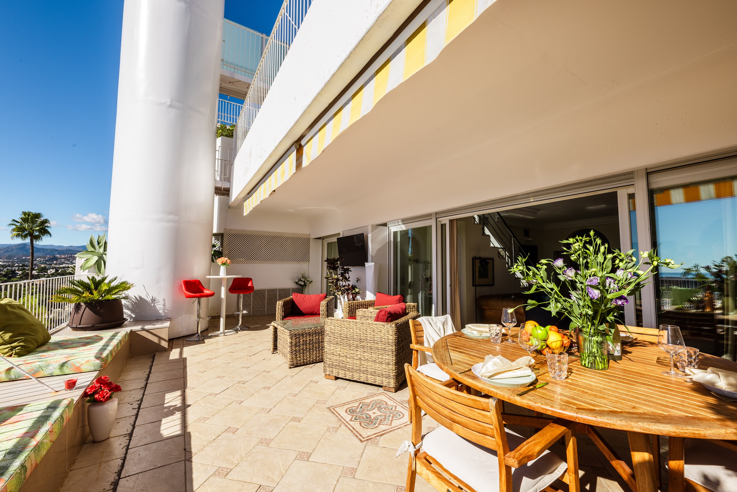 The apartment consist of a spacious living room, well equipped kitchen, 3 bedrooms (2 double, 1 twin) with en-suite full bathrooms. It features 2 sunny terraces with a comfortable seating area—perfect for enjoying your morning coffee or hosting family BBQ dinners.